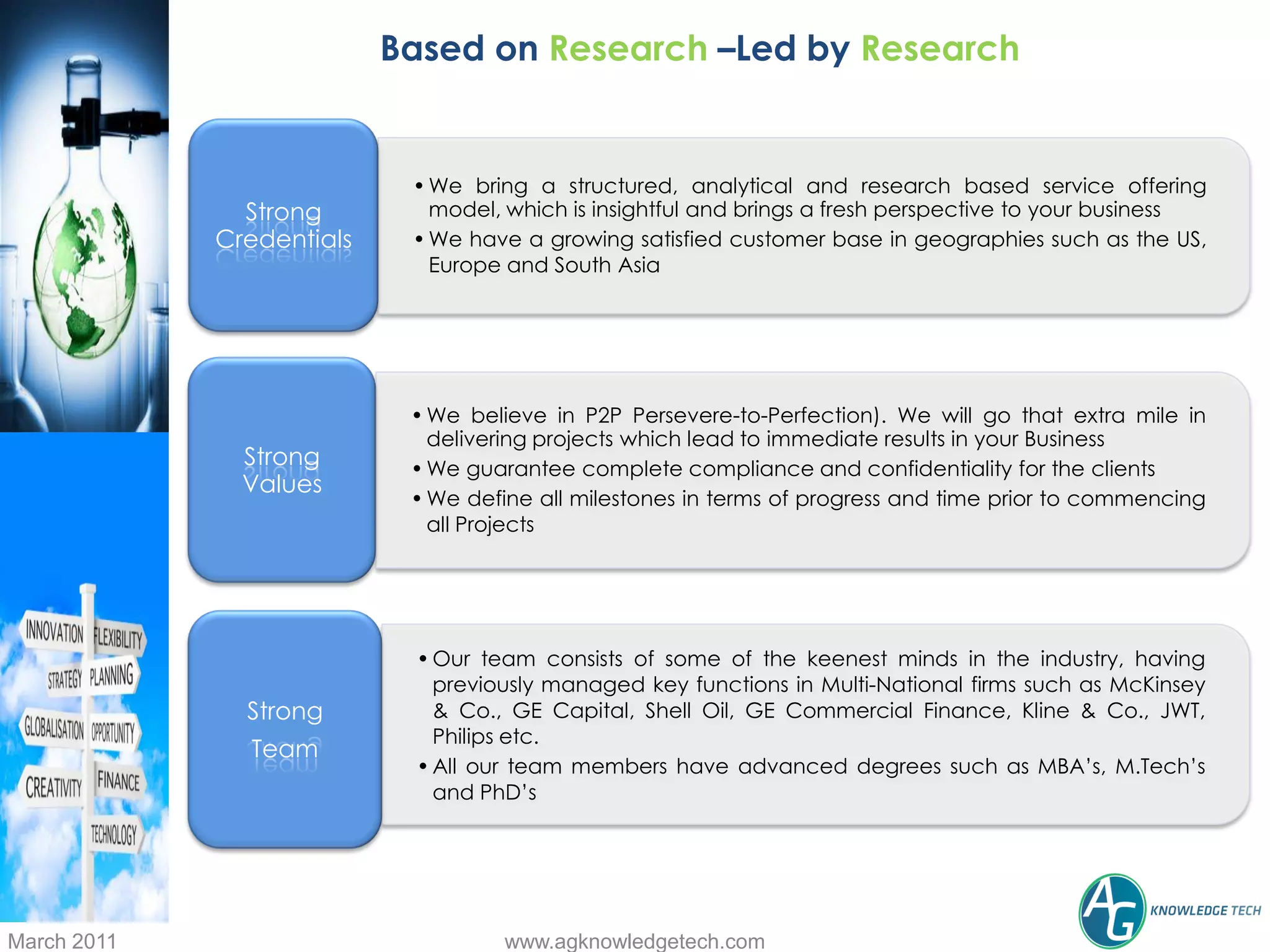 - Research-led services with a structured analytical model and growing global customer base.