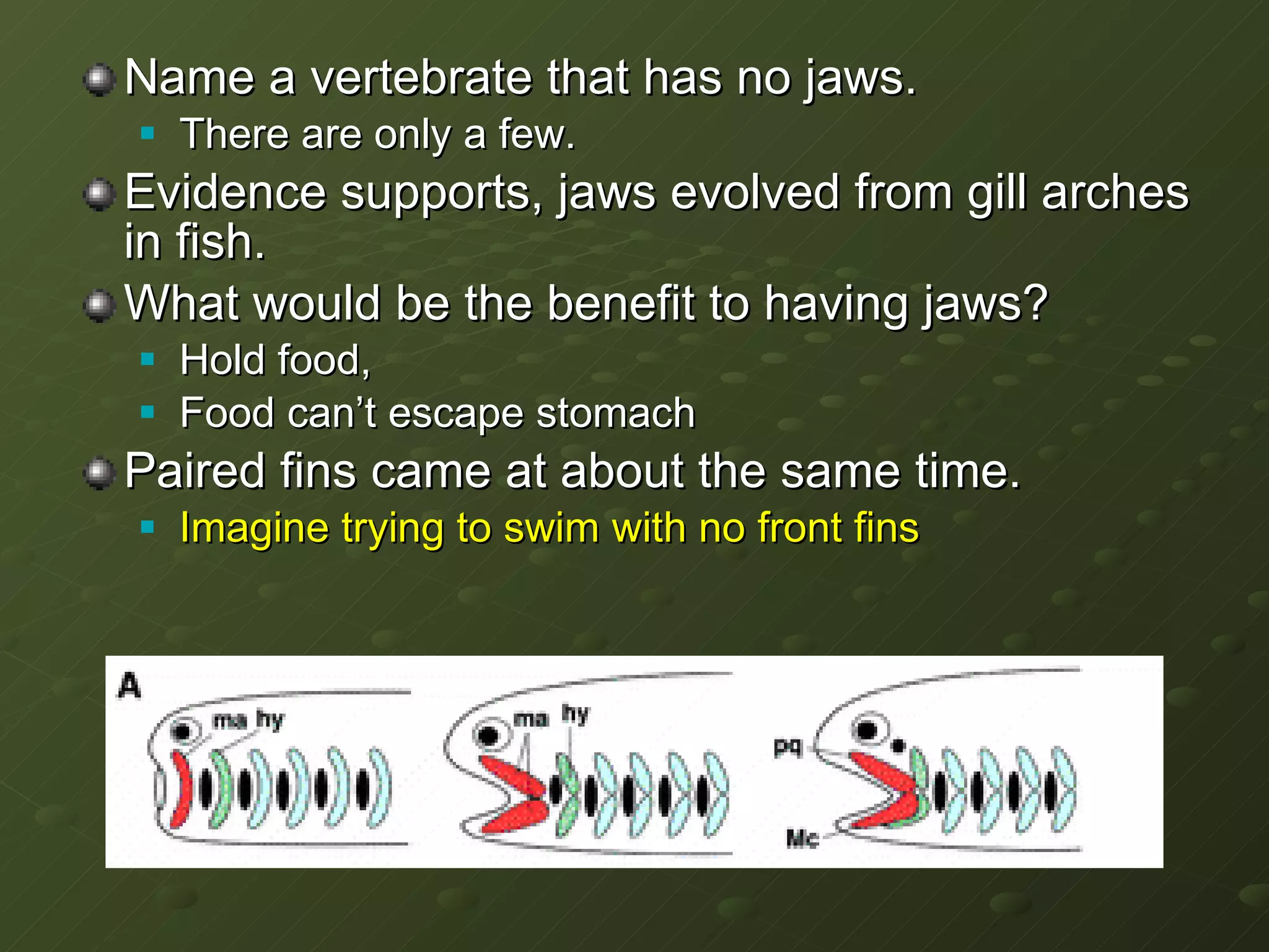 There are only a few vertebrates that have no jaws, such as lampreys and hagfish. Jaws evolved from gill arches in fish and provided benefits like being able to hold food so it couldn't escape from the stomach. Paired fins also evolved around the same time, and it would have been difficult to swim without front fins. Both lampreys and hagfish are jawless fish, with lampreys having an eel-like body structure and hagfish having eyes beneath their skin and no vertebrae.