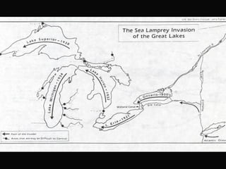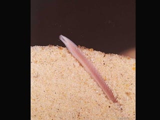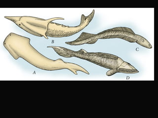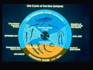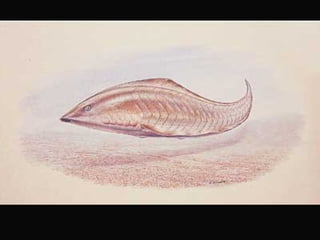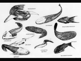 The document discusses early fish evolution, including jawless fish like hagfish and lampreys. It describes key characteristics of hagfish, including that they have no backbone but are still considered vertebrates. It then discusses different classes of jawless fish like lampreys and ostracoderms, which were early armored fish. Placoderms followed as the first jawed fish.