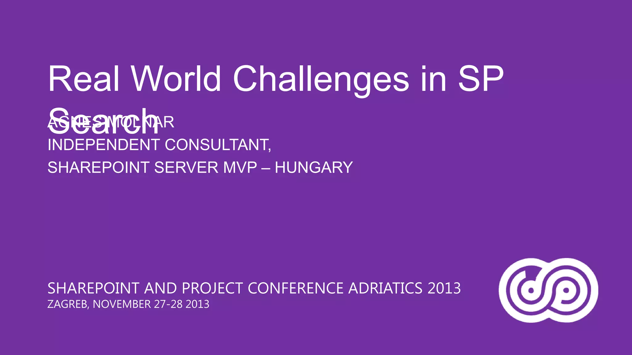 Agnes Molnar is an international SharePoint consultant and Microsoft MVP who has over 10 years of experience with SharePoint. In her presentation, she discusses some of the real world challenges organizations face with enterprise search, including information overload, the complexity of content and metadata, security, scaling, and relevance ranking. She emphasizes that search is an application that requires understanding user needs and behaviors as well as content sources in order to be successful.