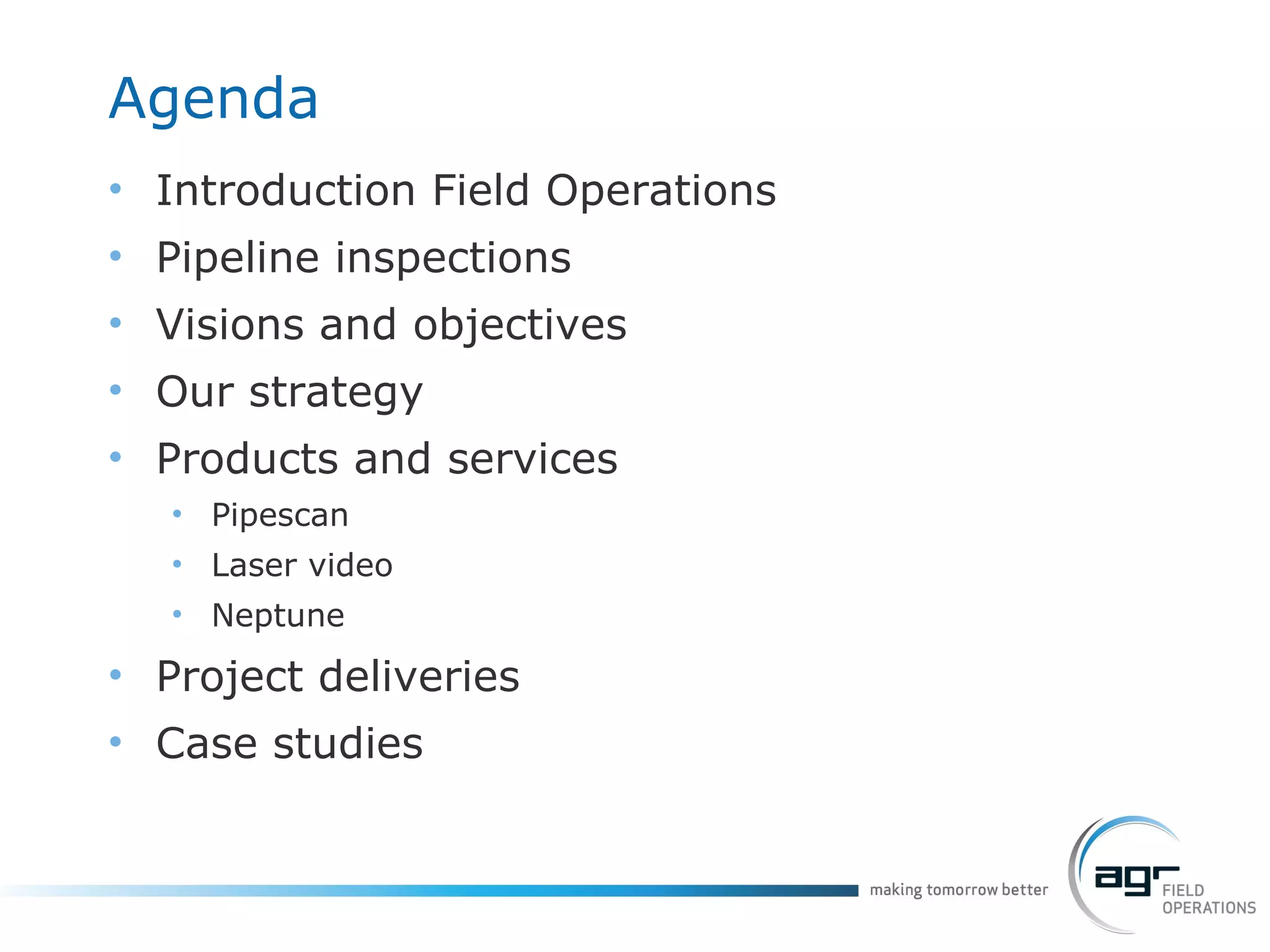 This document discusses AGR's field operations services and technologies for pipeline integrity management and inspection. It provides an overview of AGR's strategy, products and services including internal pipeline inspection tools, laser video inspection, and subsea inspection systems. It also presents case studies on internal pipeline inspections and discusses flexible riser inspection technologies.