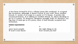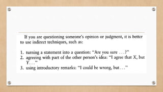 The document discusses ways to agree and disagree in conversation. It provides examples of expressions used for complete agreement, tentative agreement, direct disagreement, and indirect disagreement. It also includes a short dialogue where one person directly disagrees with another by saying "No, it doesn't" and another example where indirect disagreement is expressed by saying "That's strange."
