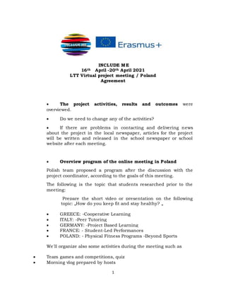 The document outlines plans for an upcoming virtual project meeting to be hosted by Poland from April 16-20, 2021. Key details include: