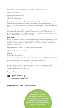 This document provides acknowledgements and contents for "The Adaptation Gap Report", which is a preliminary assessment published by the United Nations Environment Programme in November 2014. It thanks the steering committee, authors, reviewers, and coordination team who contributed to developing the report. The contents section lists 5 chapters and includes an executive summary, glossary, and list of acronyms to provide context and essential information from the document.