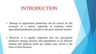 This group presentation discusses agricultural insurance. It introduces the group members and defines agricultural insurance as the equitable transfer of risk from agricultural firms to insurance companies in exchange for premiums. It then describes various types of agricultural insurance policies like indemnity-based policies, index-based policies, and revenue-based policies. The presentation also covers specific insurance products for crops, livestock, aquaculture, forestry, and greenhouses. In closing, it discusses the importance of agricultural insurance for individuals, businesses, and society by providing security, peace of mind, protecting mortgaged property, and eliminating dependency.