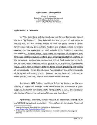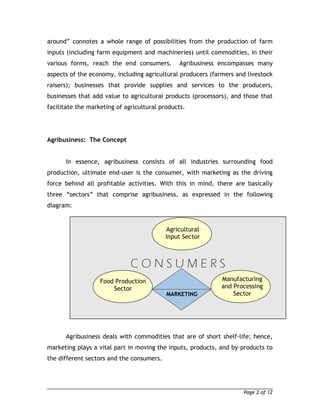 Agribusiness encompasses all operations involved in farm inputs, agricultural production, and distribution of farm products to consumers. It was defined in 1957 as including manufacture and distribution of farm supplies, on-farm production, and storage, processing and distribution of commodities. Agribusiness consists of interrelated subsystems - inputs, production, processing, marketing, and support. It integrates business management with technical agricultural knowledge across the production and distribution process. As a field of study, agribusiness applies both business and scientific principles to manage agricultural enterprises profitably from farm to consumer.