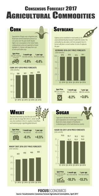 The 2017 consensus forecast for agricultural commodities indicates a decline in corn prices due to large crops in Argentina and Brazil, though a slight recovery is expected as U.S. farmers shift to more profitable crops. Soybean prices have dropped significantly due to a record harvest in Brazil and increasing U.S. planting intentions. Sugar prices also fell on expectations of a large Brazilian harvest, while wheat prices have risen due to reduced U.S. acreage and increased global demand.
