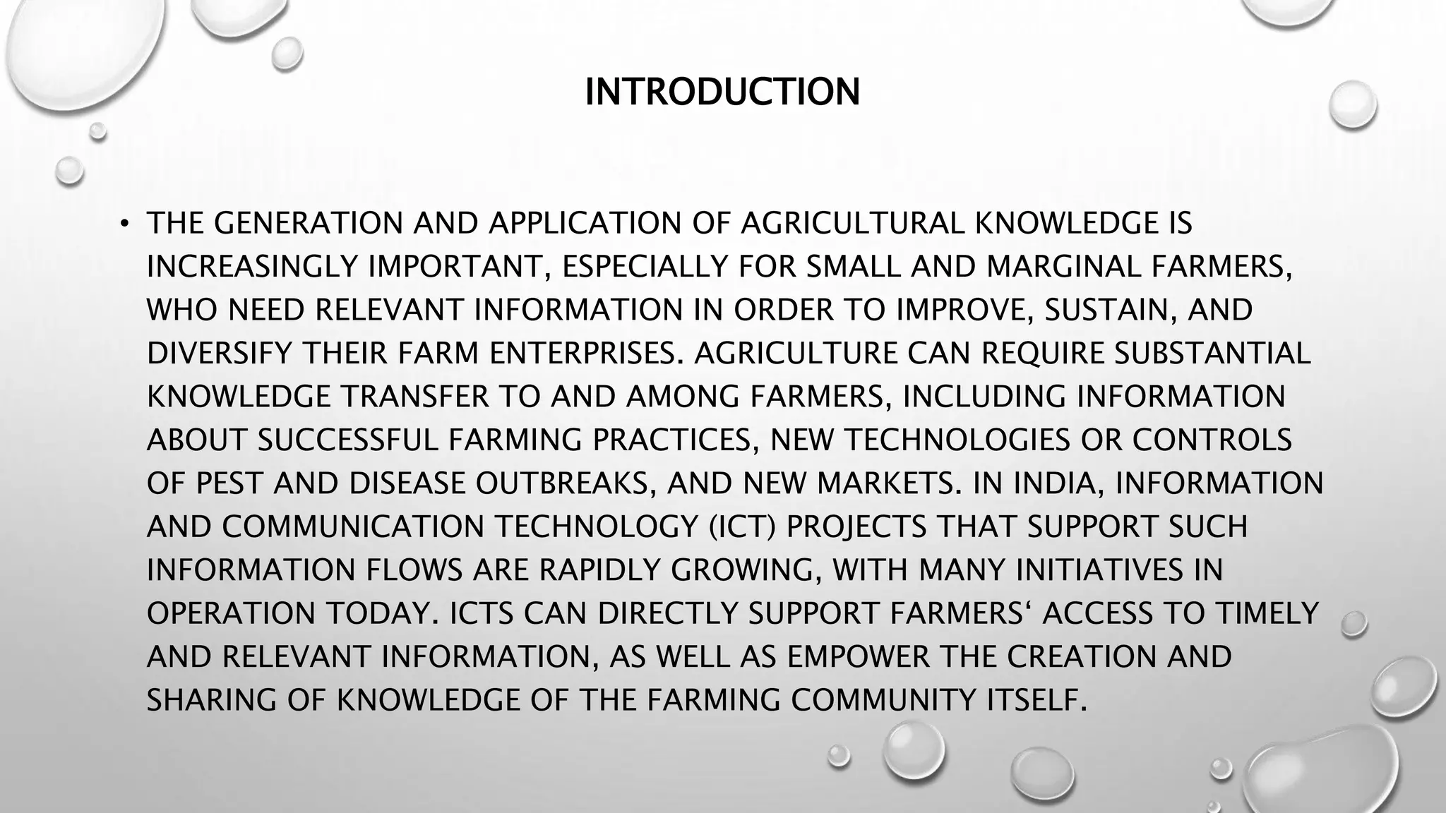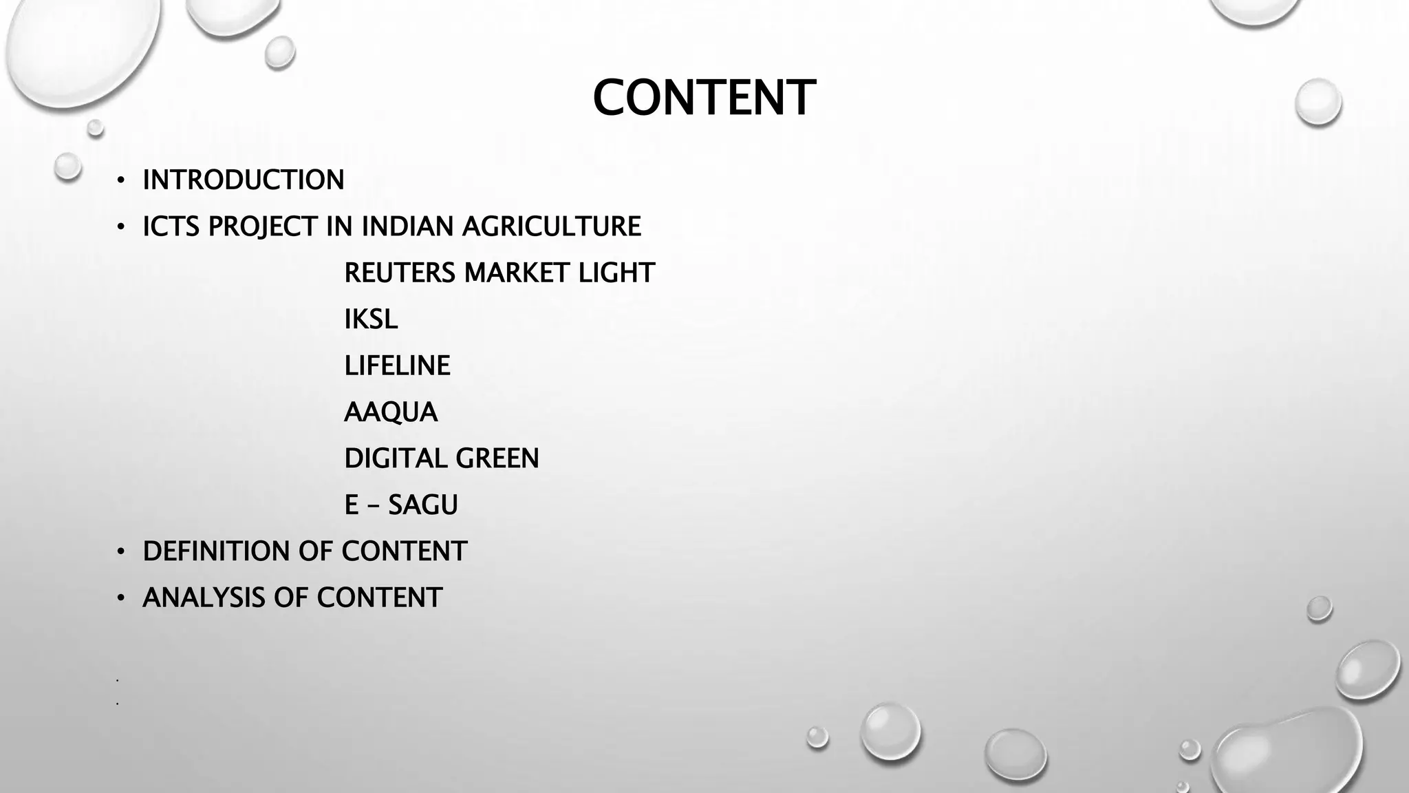 The document discusses several ICT projects in Indian agriculture that aim to provide farmers, especially small and marginal farmers, with relevant agricultural information and knowledge. It describes projects like Reuters Market Light, IFFCO Kisan Sanchar Limited, Lifelines, aAqua, Digital Green, and e-Sagu. These projects deliver information to farmers on topics like market prices, weather, crops via SMS, voice messages, photos, and online question/answer platforms. The document also discusses how these projects define appropriate content and analyze the quality, relevance and accuracy of the content provided to farmers.