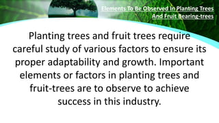 The document discusses essential factors for successful tree and fruit tree planting, emphasizing climate, soil, and water as key elements. It highlights the market demand for fruit farming and showcases notable orchard farms in the Philippines, including Rosa Farms, Rock Farm, Philippine Mango Seedling Farm Corporation, Davao Golden Pomelo Farm, and Nica's Rambutan Farm. These farms are noted for their unique offerings and contributions to the local agricultural industry.