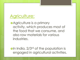 This document provides an overview of agriculture in India. It discusses that agriculture is the primary activity in India, with 2/3 of the population engaged in it. It describes the different types of farming practiced in India, including subsistence and commercial farming. It also outlines the major crops grown in India like rice, wheat, millets, pulses, sugarcane, oilseeds, tea, and horticulture crops. It summarizes the key reforms and programs implemented to support Indian agriculture.
