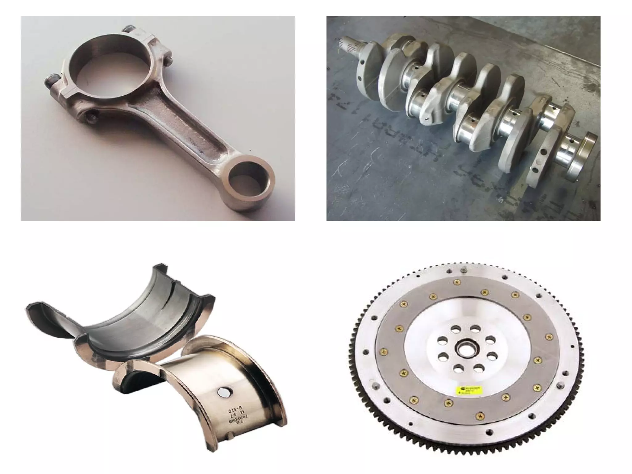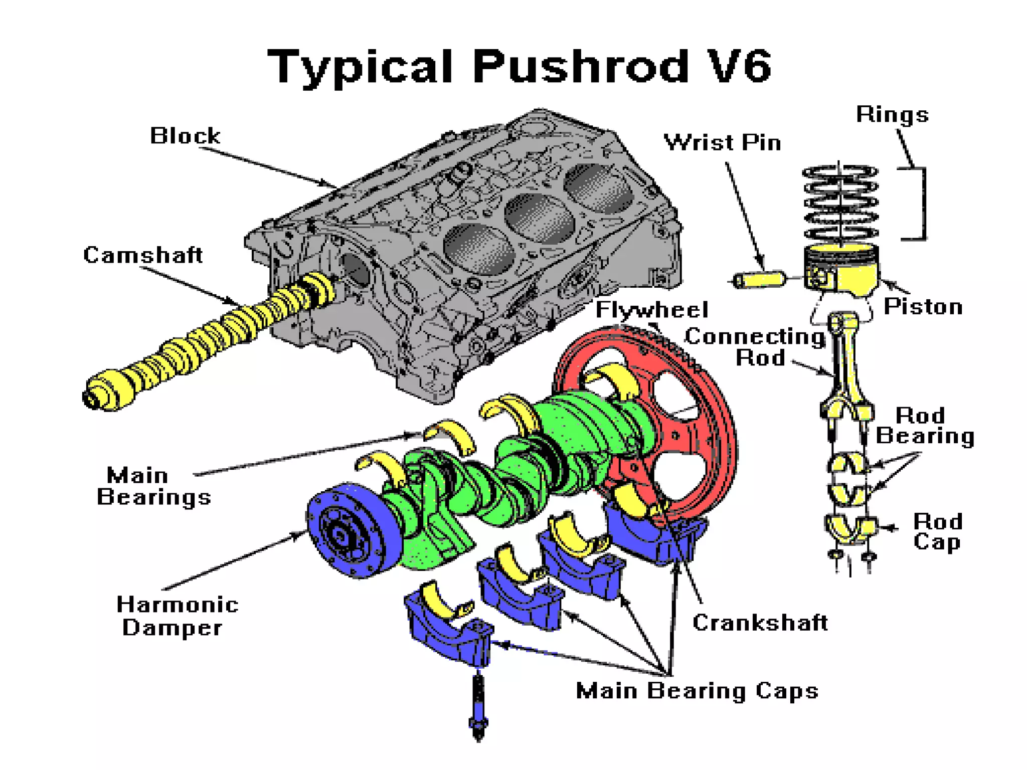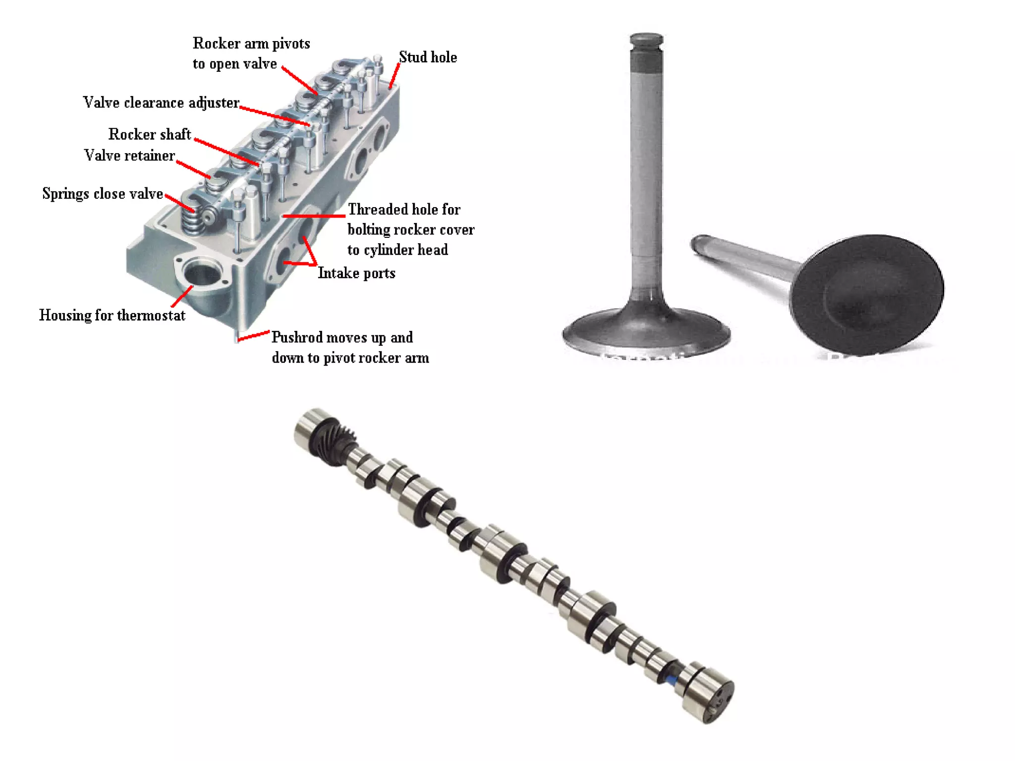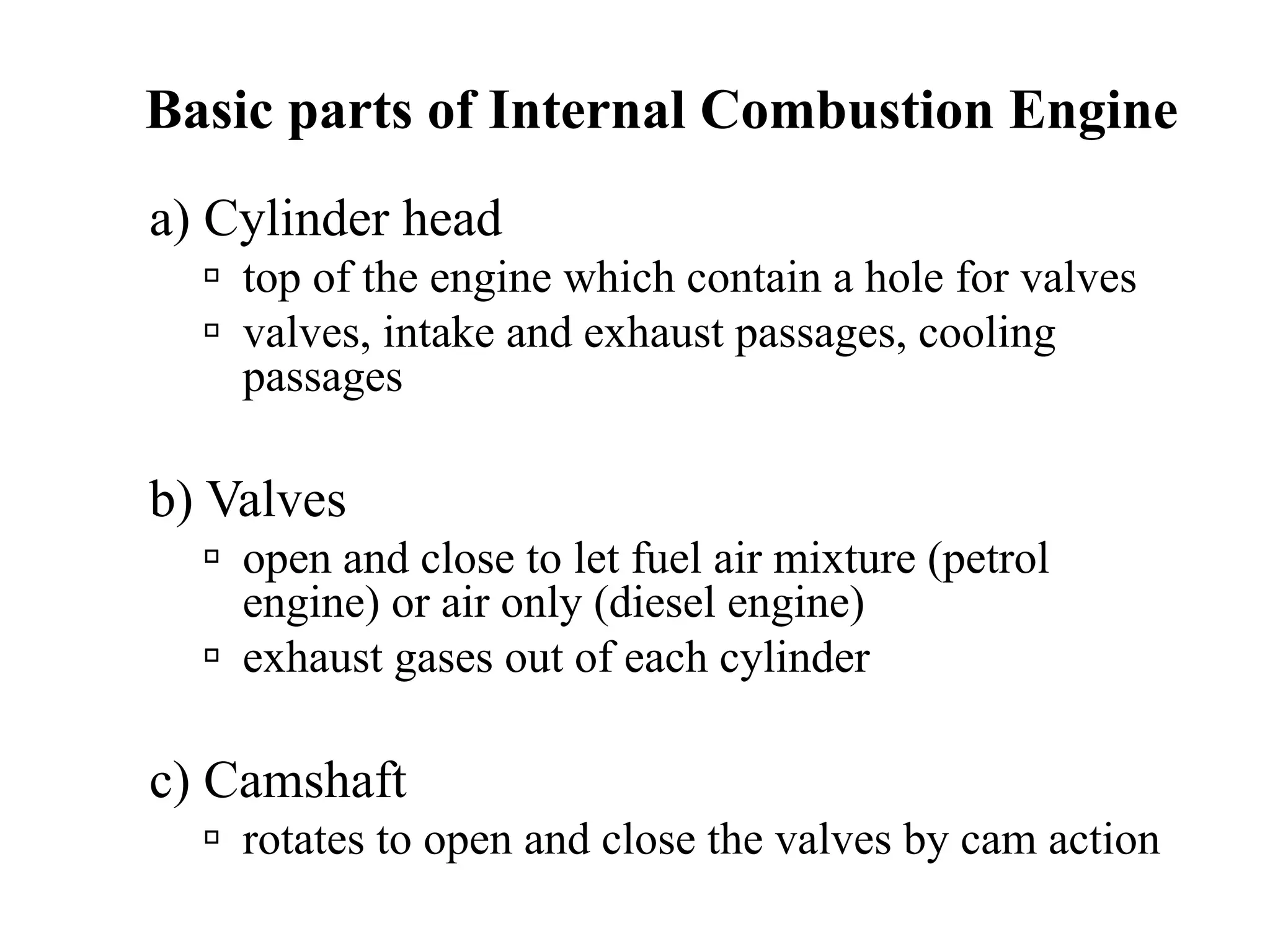 The document provides information about the basic parts of an internal combustion engine. It lists and describes the main components including the cylinder head, valves, camshaft, cylinder block, cylinders, piston, connecting rods, crankshaft, main bearings, flywheel, and timing drives. It explains their functions and how they work together in the engine combustion cycle.