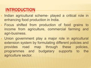 The agricultural extension system in India plays a key role in enhancing food production and shifting focus from only production to also commercial farming and agribusiness. The system involves policies and programs from the central government and state-specific development programs. The ICAR is the national body that supports research and technology transfer models. State agricultural universities also develop extension models. Voluntary organizations implement extension projects. The system bridges research centers and farmers through extension personnel.