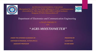 This document presents a project on designing an "Agri-Moistiometer" to measure soil moisture content at different depths from the surface to the root zone. It discusses problems with existing soil moisture sensors and the objectives and innovation of the proposed system. The system methodology, block diagram, implementation details and prototype are described. Results from testing show soil moisture readings at different saturation levels and sensor outputs displayed on an OLED screen and uploaded to cloud storage. The document concludes with a work plan and references.