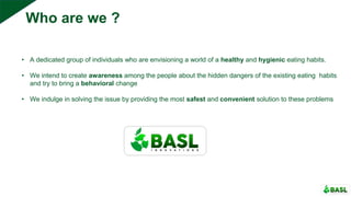 Basl Innovations Pvt Ltd aims to promote healthy eating habits by raising awareness about the dangers of current food handling practices. The company offers Agripur, a natural solution that effectively removes pesticide residues, bacteria, and toxins from fruits, vegetables, and meat without altering their taste or texture. Agripur has received endorsements from various professionals and organizations, highlighting its efficacy and safety for both households and commercial kitchens.