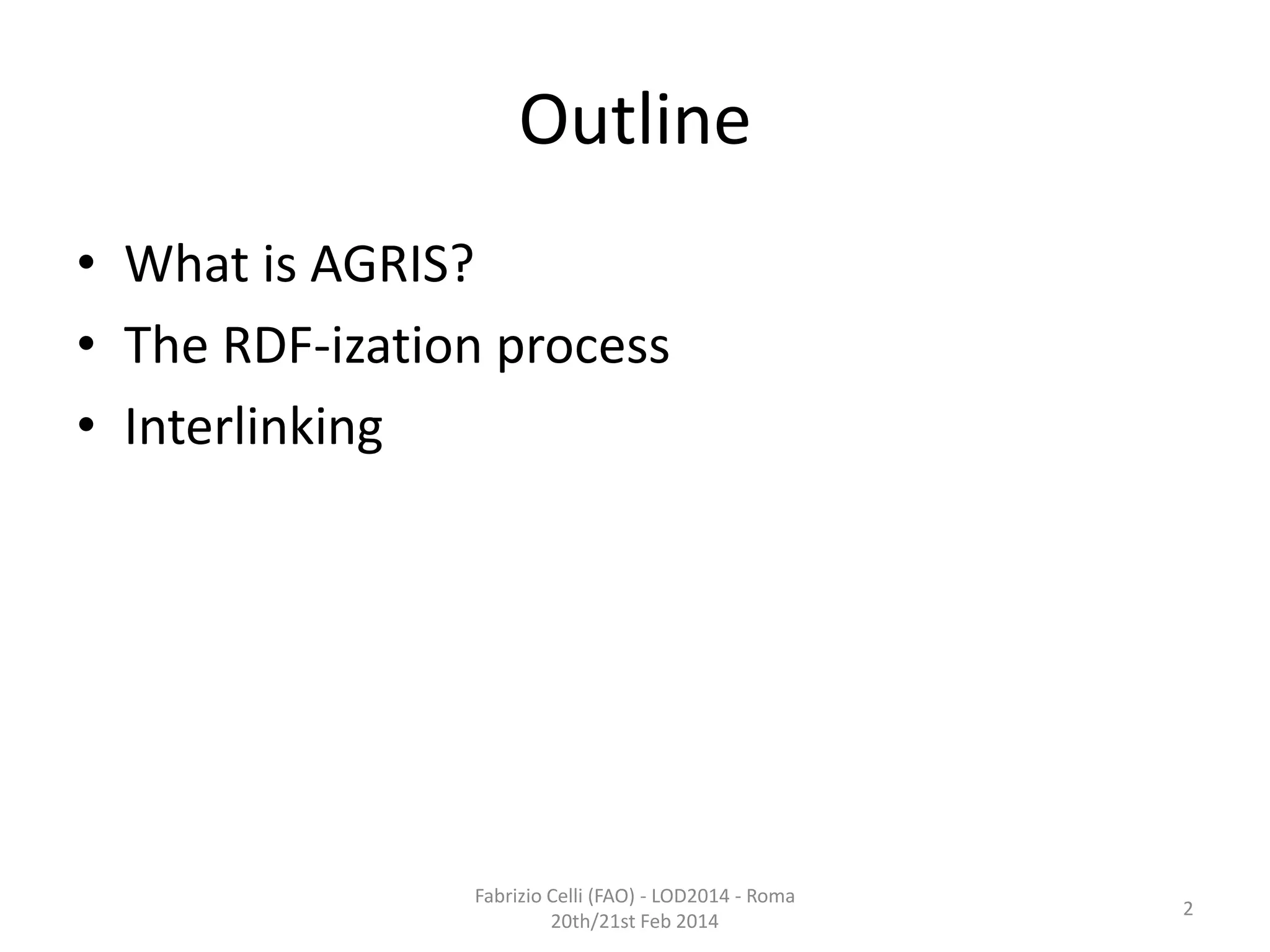 AGRIS is a collaborative network and multilingual bibliographic database focused on agriculture, containing over 7.7 million references linked using RDF and the Agrovoc thesaurus. This RDF-aware system allows users to interlink AGRIS content with external resources and supports various data formats for integration. The document outlines the RDF-ization process, its statistics, and interlinking methodologies to enhance agricultural knowledge sharing.