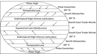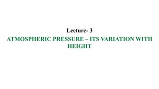 This document provides an overview of atmospheric pressure and how it varies with height, location, time of day, and season. It discusses that pressure decreases with increasing height due to lower air density. Horizontally, pressure varies with temperature, latitude, and land/sea distribution, forming belts of high and low pressure. Diurnally, pressure shows two highs and lows as air expands and contracts. Seasonally, pressure varies more in tropical regions due to changes in solar heating. Isobars on maps connect places of equal pressure, and their spacing indicates the rate of pressure change.