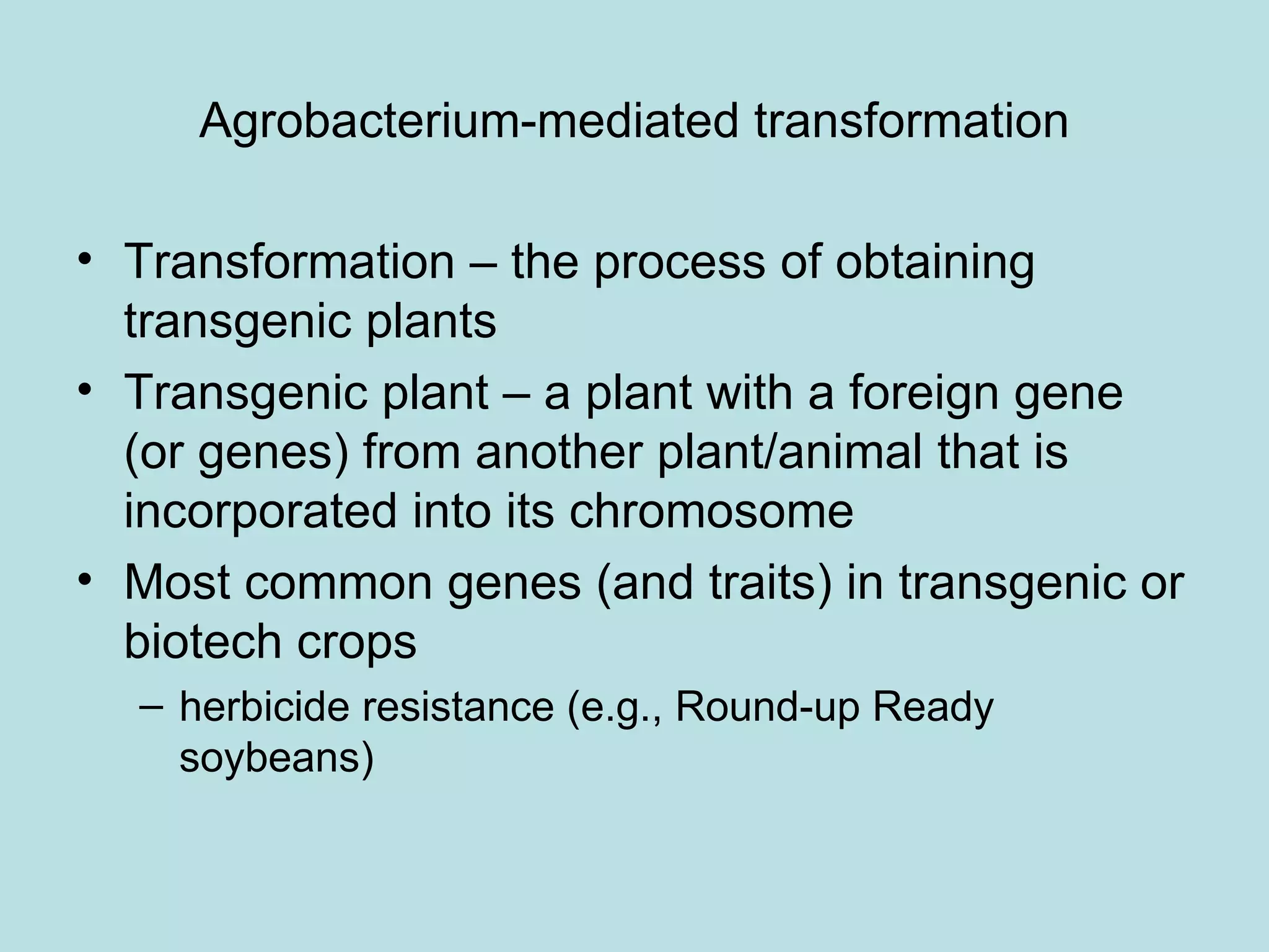 The document discusses Agrobacterium-mediated transformation, which is a common method for inserting foreign genes into plant chromosomes to create transgenic plants. It involves using Agrobacterium containing binary vectors with genes of interest and antibiotic resistance markers. The Agrobacterium infects plant cells and transfers T-DNA containing the genes into the plant genome. Transformed plants are selected and tested to verify insertion of the new genes.