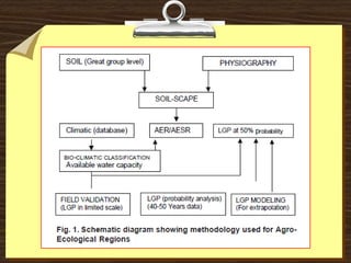 This document provides an overview of agro-ecological zoning in India. It describes how India has been divided into 20 agro-ecological regions and 60 agro-ecological subregions based on soil type, climate, and physiography. Each zone is further classified into agro-ecological units at the district level. Several of the major agro-ecological zones are then described, including the climatic characteristics and soil types found in each. The purpose of agro-ecological zoning is to assess crop yield potential, formulate plans for crop diversification, and determine optimal land use across different regions of the country.