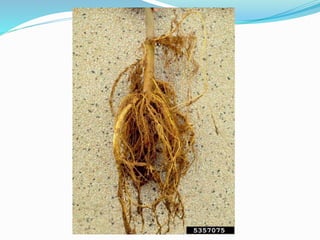 The document describes two major diseases caused by Agrobacterium in plants: crown gall and hairy root. Crown gall is characterized by galls on roots and stems, while hairy root involves excessive growth of adventitious roots and affects plant vitality. Several control measures are discussed, including field sanitation, crop rotation, chemical treatments, and biological control methods.