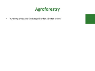 •Agroforestry is a land-use system where trees, crops, and sometimes animals are