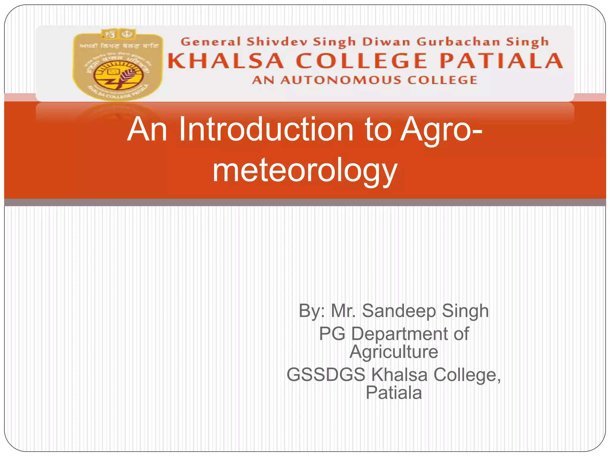 This document provides an introduction to agro-meteorology. It defines key terms like climatology, meteorology, agro-climatology, and agro-meteorology. Agro-meteorology examines the relationship between weather, climate, and agriculture. It seeks to understand how meteorological and hydrological conditions impact agriculture. The scope of agro-meteorology is to apply meteorological knowledge to improve crop production and develop sustainable agricultural systems.