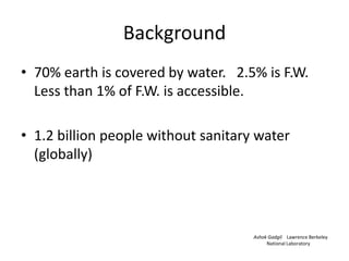 Water quality and sanitation are major issues in developing countries. Approximately 1.2 billion people lack access to clean drinking water. Water is polluted from agricultural, industrial, and household sources, with agriculture being the largest contributor. This pollution causes diseases like malaria and diarrhea, which are responsible for hundreds of thousands of child deaths each year globally. An example is given of Mexico City, which lacks proper sewage systems and disposal, draining sewage into crop fields and causing the city to sink due to overpumping of water. The issues persist because governments cannot afford or do not have the knowledge to implement modern water and sanitation systems.