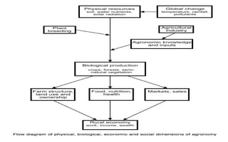 Agronomy is the study of crop production and soil management. It involves identifying suitable cultivation seasons, applying fertilizers and herbicides, managing water, implementing new technologies, and maintaining ecological balance. Agronomy is related to other agricultural sciences like soil science, crop physiology, and plant ecology. Crops are classified in various ways for better understanding, including by their life cycle (annual, biennial, perennial), economic use (cereals, millets, pulses, oilseeds), and botanical traits. The major crops grown in India are classified based on season (kharif, rabi, summer) and climate (tropical, sub-tropical, temperate, polar).