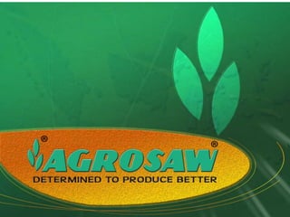 This document provides information on Agrosaw, an Indian manufacturer of cleaning, grading, sorting and handling equipment for seeds, grains, spices, pulses, oil seeds, fruits and vegetables. It was founded in 1984 and has three manufacturing plants with state-of-the-art facilities. The document outlines various machines and plants produced by Agrosaw, including round fruit sorting lines, vegetable grading lines, bagging machines, conveyor systems, and potato and apple grading equipment. It provides details on the specifications and capabilities of the different machines.