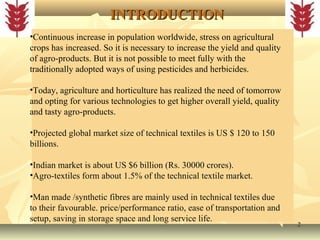 1. The document discusses various types of agrotextiles used in agriculture, horticulture, and animal husbandry to control the environment for plants and animals. Some examples provided include shade nets, crop covers, windshields, weed control discs, and bird protection nets.