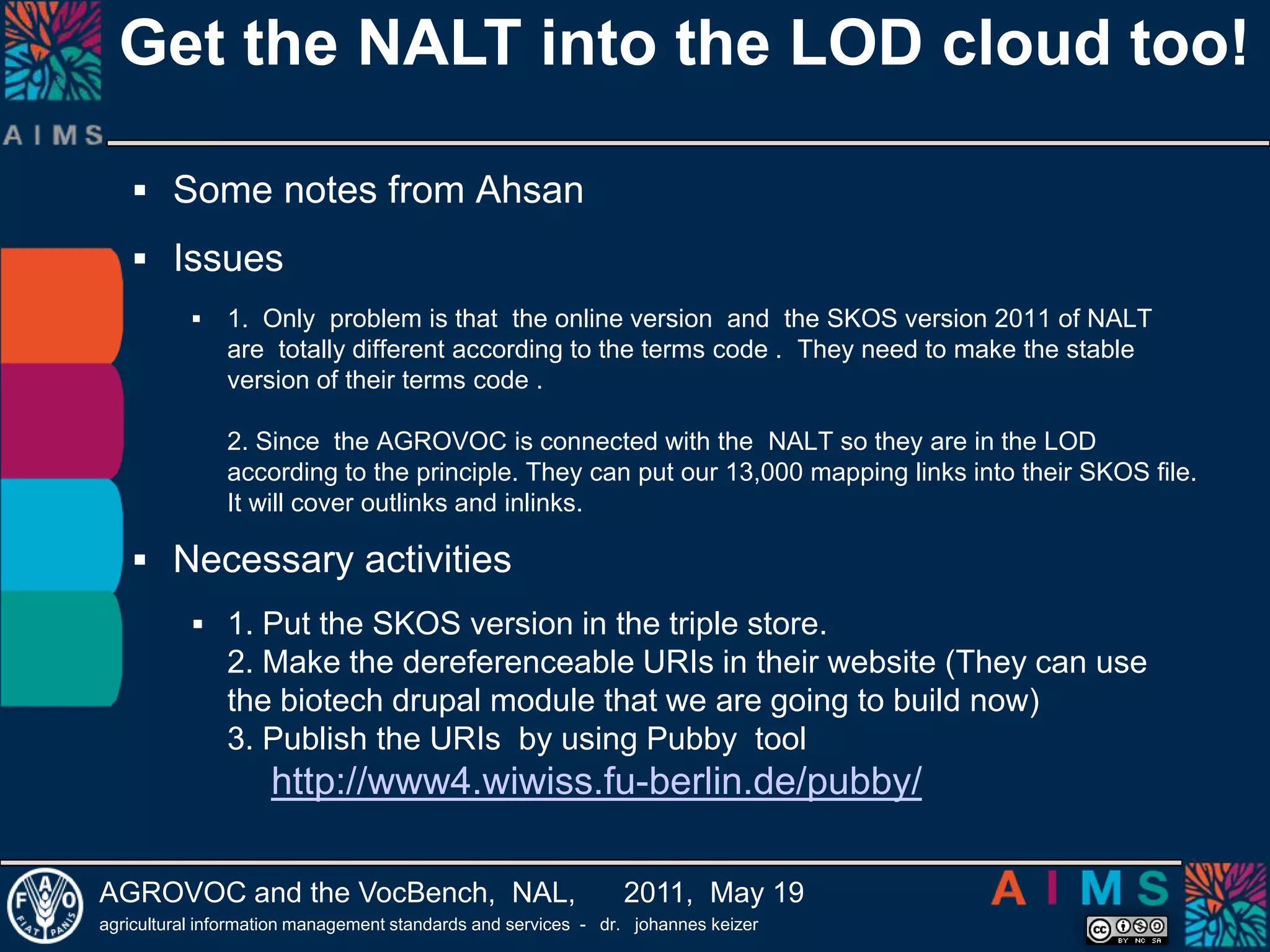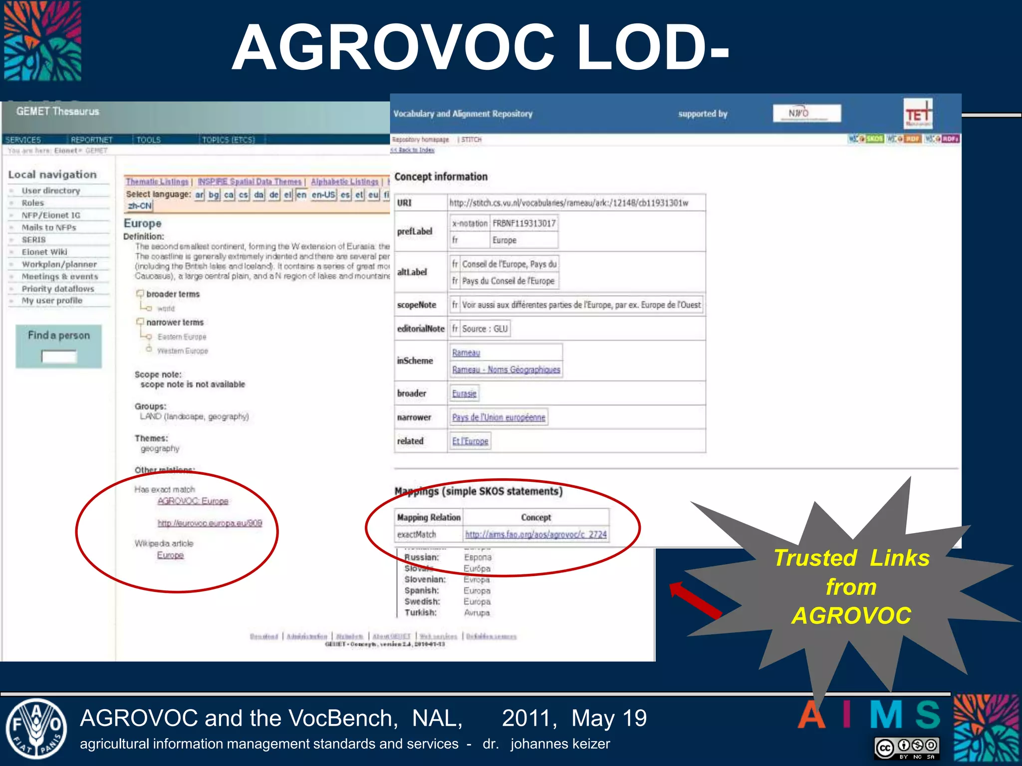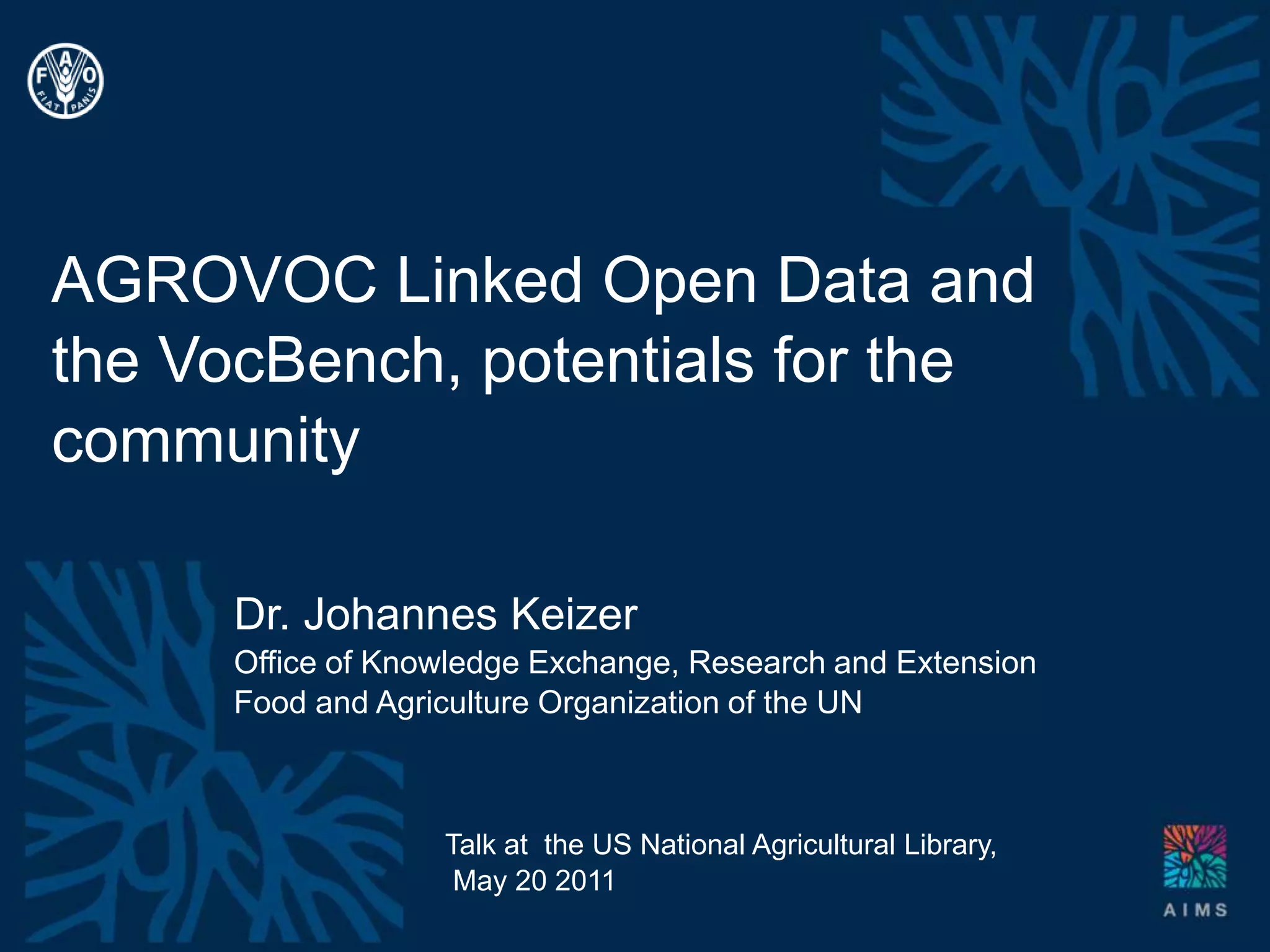 This document summarizes a talk given by Dr. Johannes Keizer about AGROVOC Linked Open Data and the VocBench tool. It discusses how AGROVOC has been restructured from a traditional thesaurus to a concept scheme with 25 top concepts and refined relationships. It also describes how AGROVOC has been published as Linked Open Data, connecting to other vocabularies like EUROVOC, RAMEAU, and NALT. The VocBench is introduced as a tool for editing vocabularies that can output RDF formats. Linking vocabularies is described as important for connecting related datasets and allowing unified searching across sources.