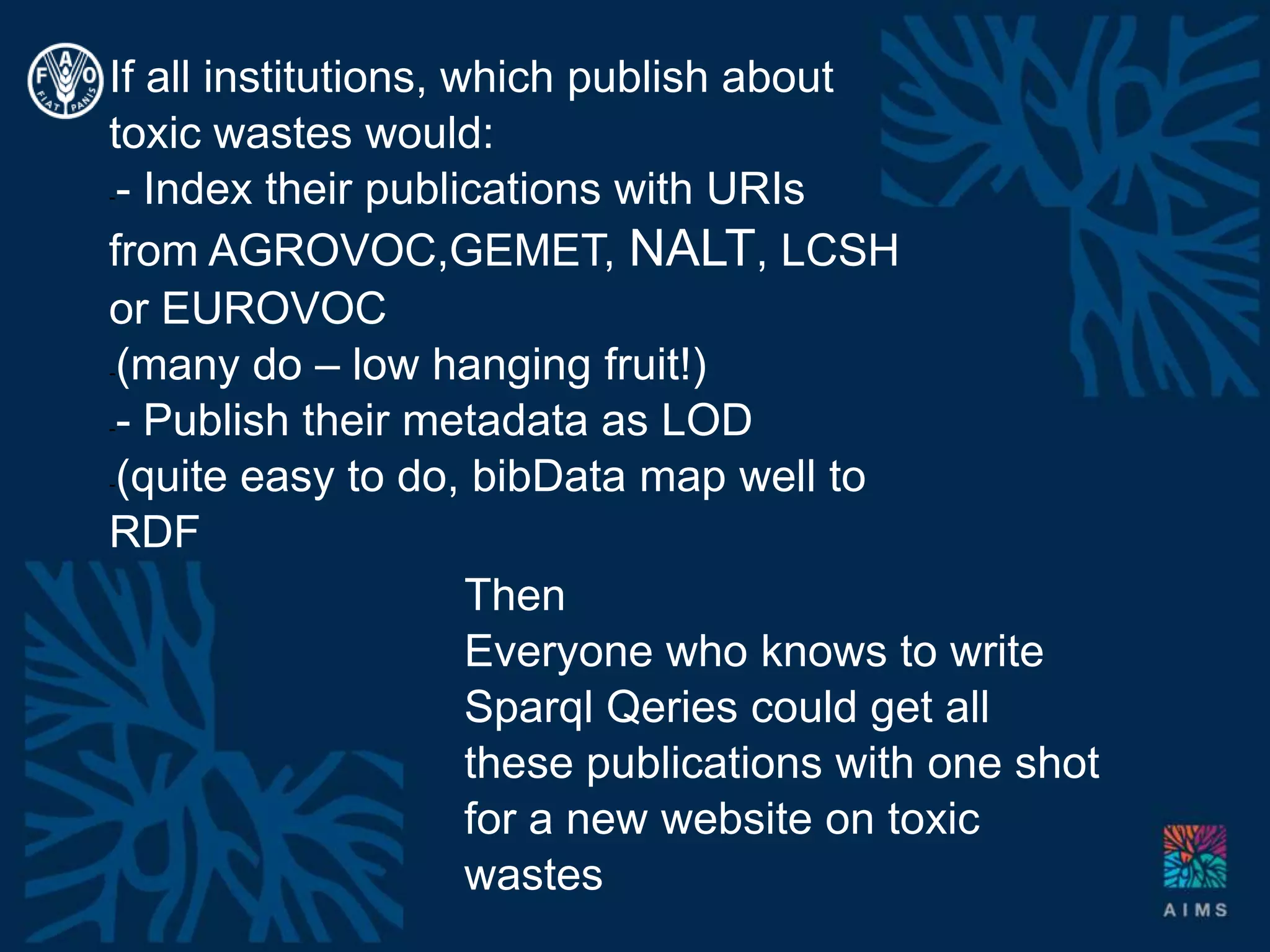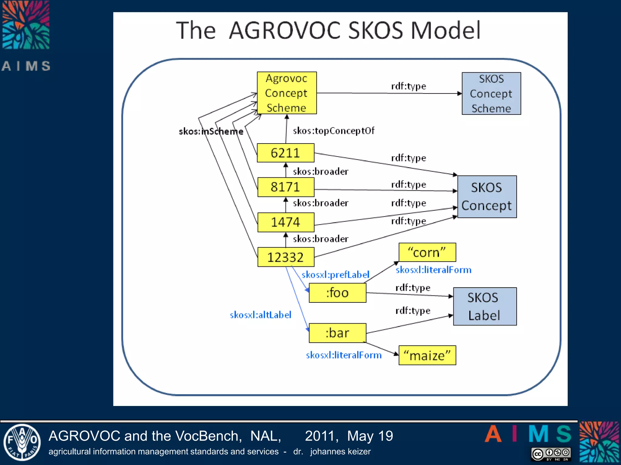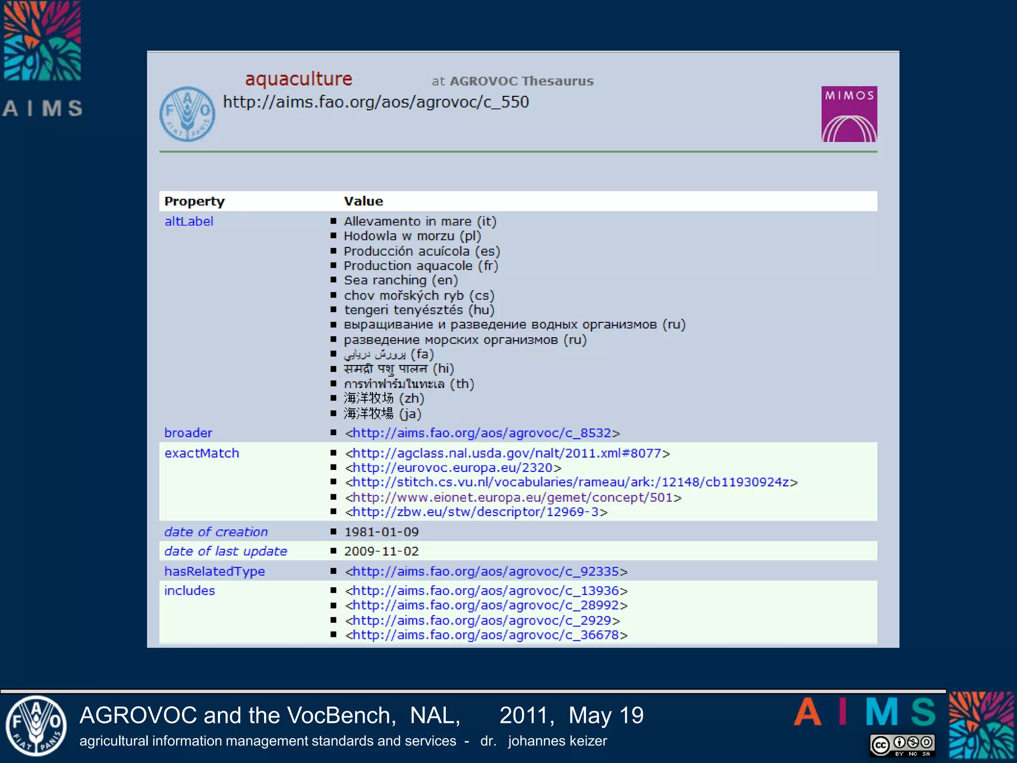 This document summarizes a talk given by Dr. Johannes Keizer about AGROVOC Linked Open Data and the VocBench tool. It discusses how AGROVOC has been restructured from a traditional thesaurus to a concept scheme with 25 top concepts and refined relationships. It also describes how AGROVOC has been published as Linked Open Data, connecting to other vocabularies like EUROVOC, RAMEAU, and NALT. The VocBench is introduced as a tool for editing vocabularies that can output RDF formats. Linking vocabularies is described as important for connecting related datasets and allowing unified searching across sources.