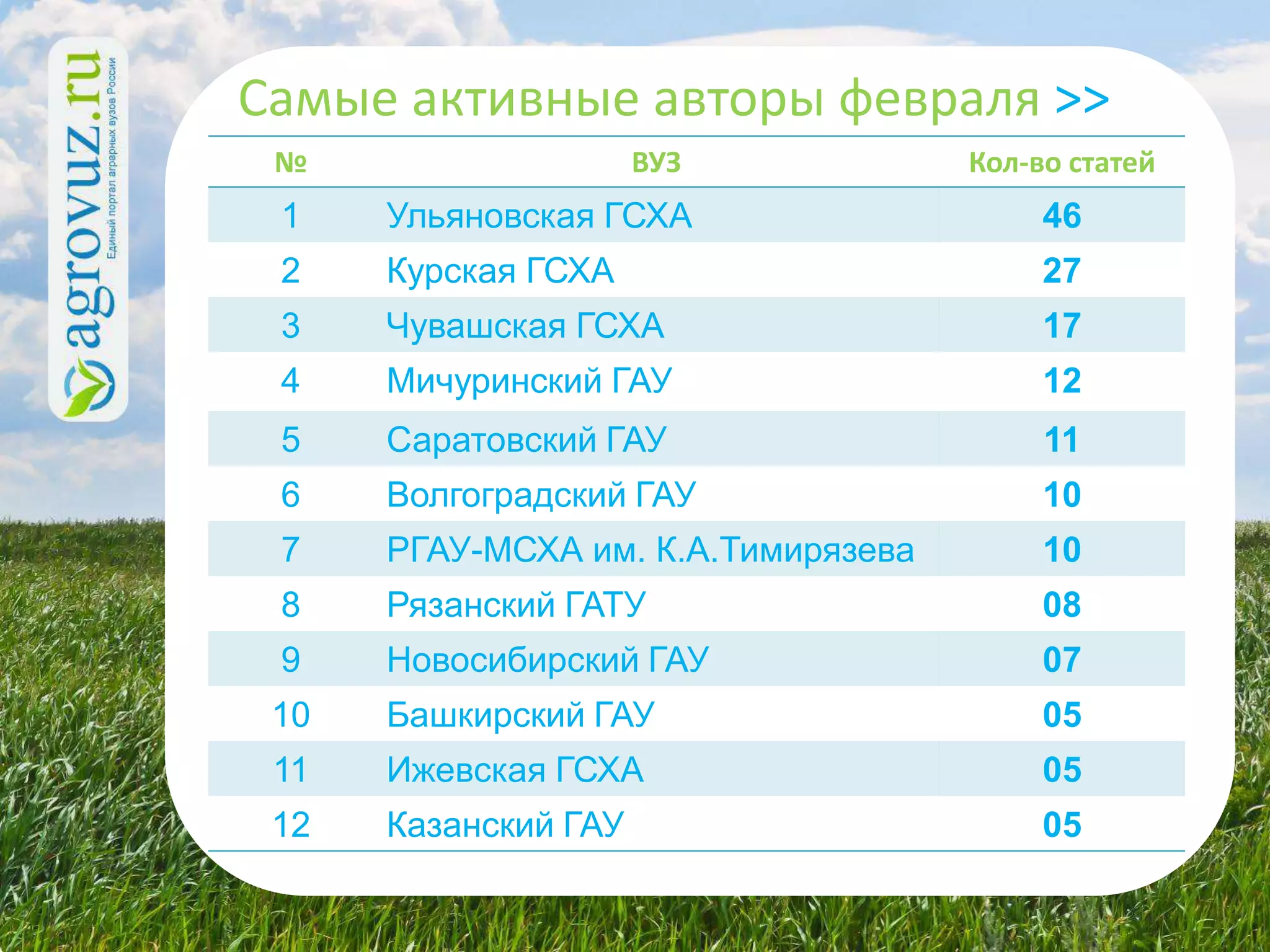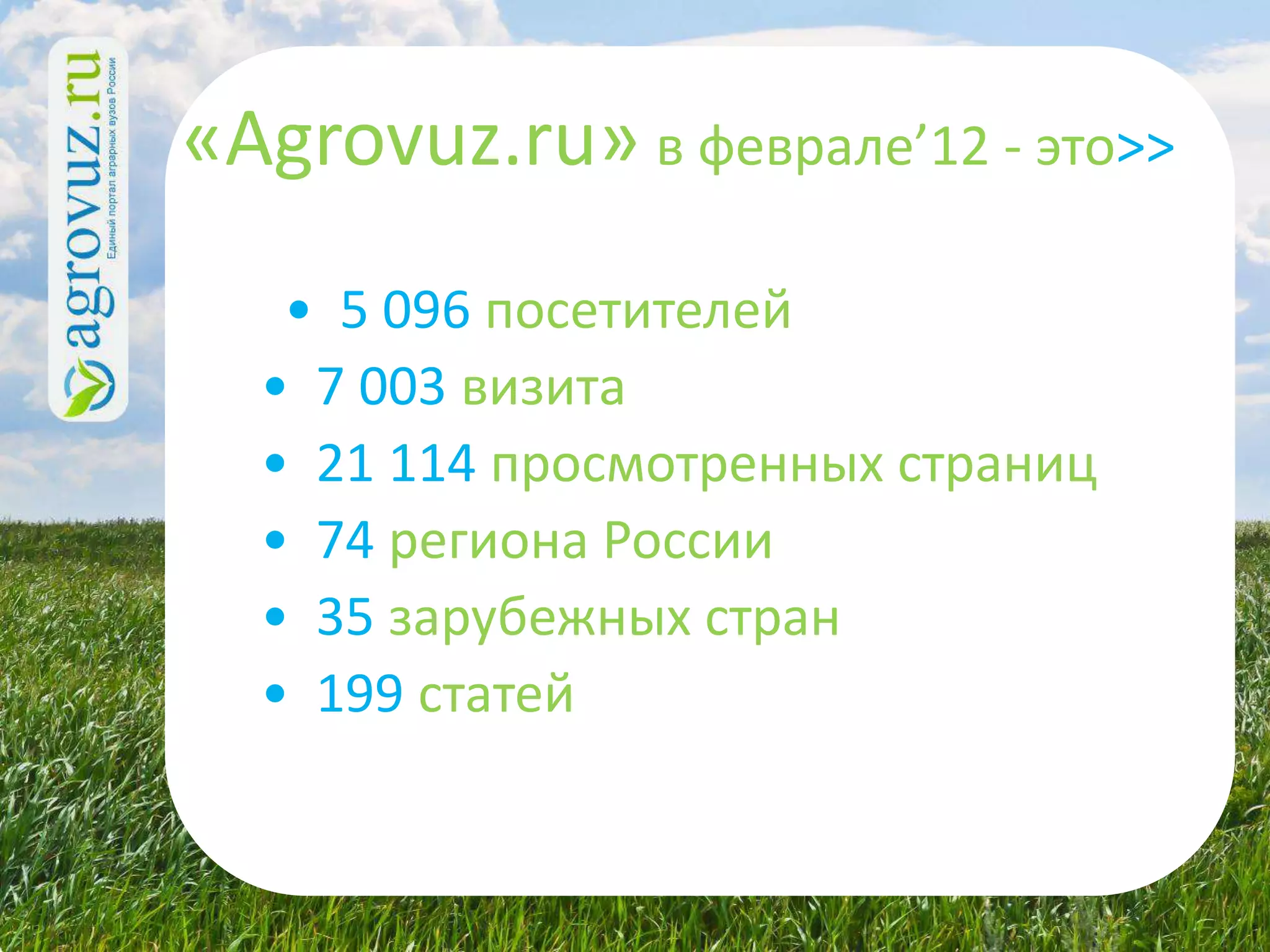 В феврале 2012 года сайт 'agrovuz.ru' привлек 5 096 посетителей, совершивших 7 003 визита и просматривавших 21 114 страниц из 74 регионов России и 35 зарубежных стран. Самые активные авторы публикаций представляют различные аграрные вузы, с наибольшим числом статей от Ульяновской ГСХА. Сайт демонстрирует рост популярности, с учетом значительной доли посетителей, пришедших с поисковых систем и из других источников.