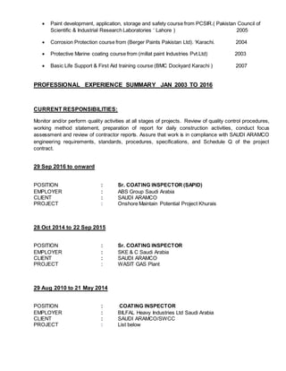 Abdul Ghaffar has over 13 years of experience in QA/QC coating inspection for oil and gas, ship construction, and water treatment projects. He is seeking a position that allows him to apply his coating inspection skills and update his knowledge. He has a Diploma in Associate Engineering and certifications in painting inspection from BGAS and safety training. His responsibilities include monitoring quality, reviewing procedures, and ensuring work complies with standards.