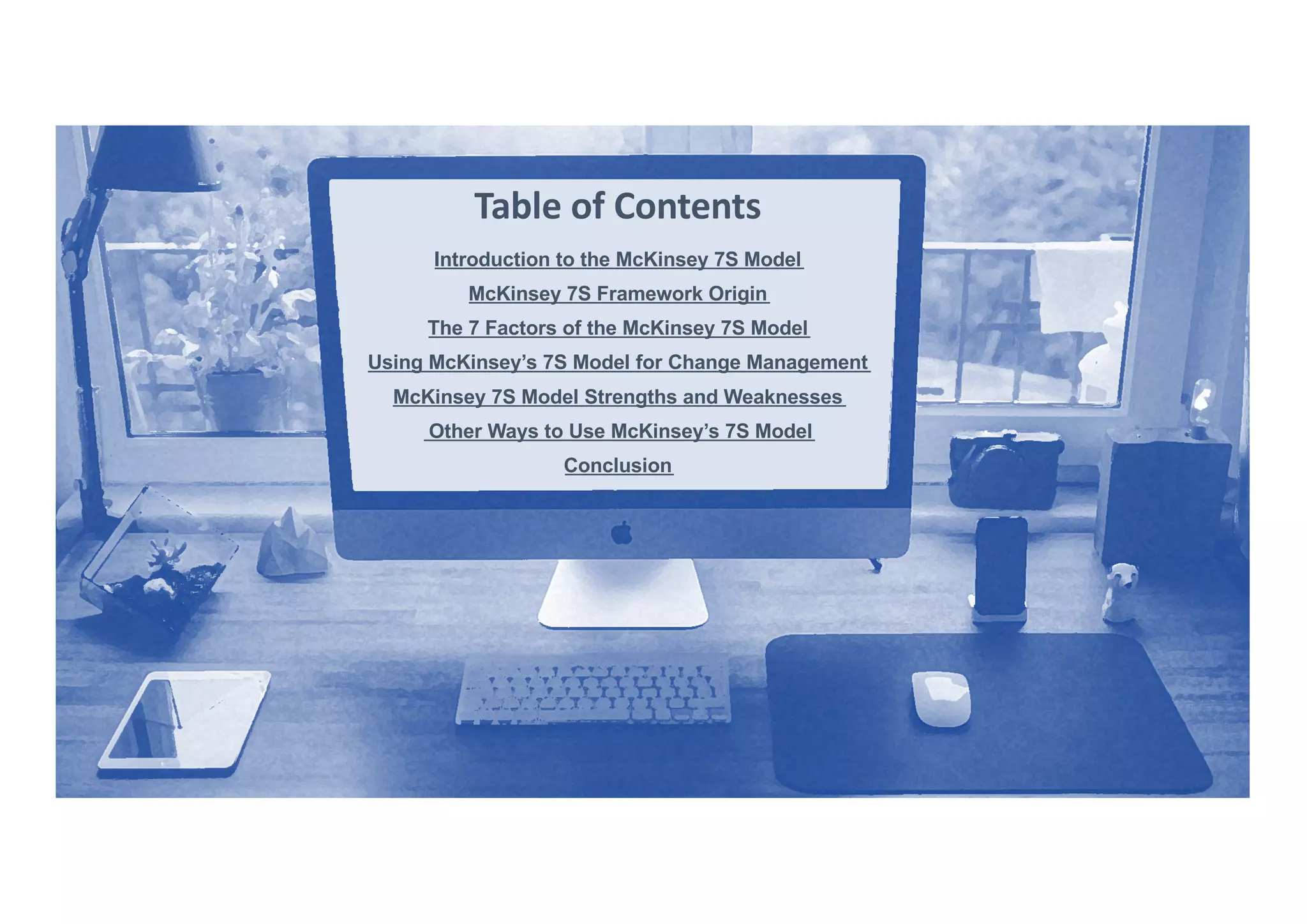 The McKinsey 7S framework provides a holistic approach to analyzing an organization across seven factors: shared values, skills, staff, strategy, structure, style, and systems. These factors must be balanced and aligned for an organization to operate effectively. The framework can be used to assess how a change initiative may impact each factor and ensure they remain in harmony. While it does not provide a step-by-step process, using the 7S model at the start and end of a change project can help gauge organizational health and identify opportunities for improvement. Its strength is the comprehensive view it provides, though it may be tedious to apply to large-scale changes.