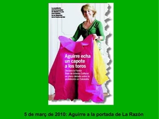 Esperanza Aguirre a les portades d'El Mundo, La Razón i ABC en motiu del debat en el Parlament de Catalunya sobre les curses de braus. Aguirre vol declarar els toros Bé d'Interès Cultural.