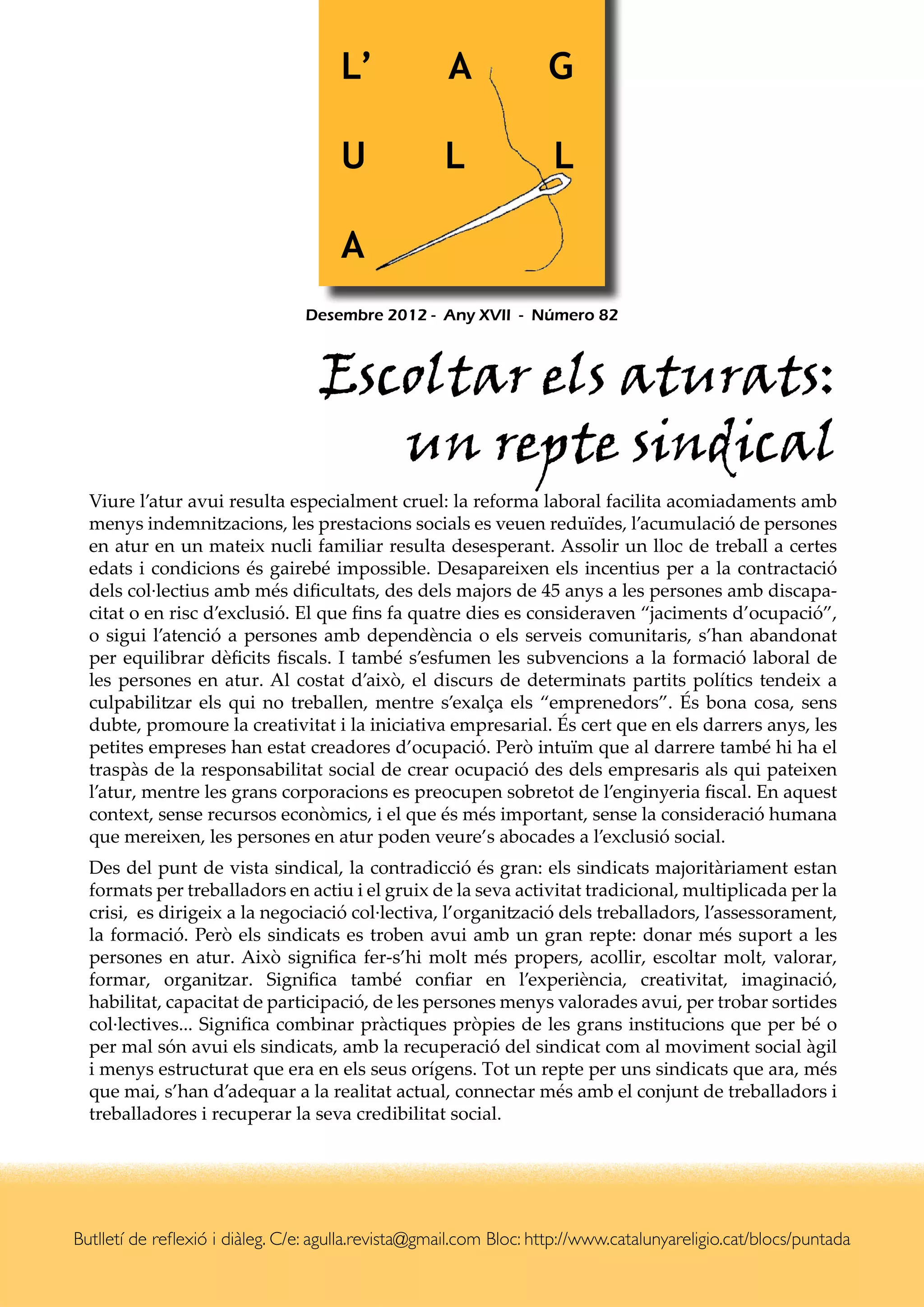 Butlletí de reflexió i diàleg. C/e: agulla.revista@gmail.com Bloc: http://www.catalunyareligio.cat/blocs/puntada