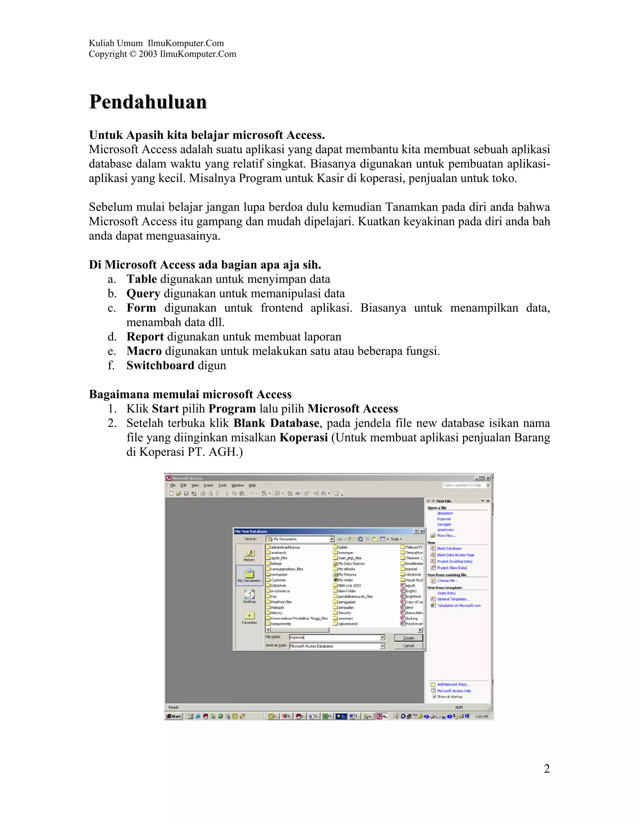 Dokumen ini memberikan panduan tentang cara membuat aplikasi sederhana menggunakan Microsoft Access, termasuk penjelasan mengenai tabel, kueri, dan formulir. Langkah-langkah terperinci disediakan untuk membuat tabel yang menyimpan data, kueri untuk memanipulasi data, serta formulir untuk interaksi pengguna. Dokumen ini juga mencakup tips untuk mendesain antarmuka pengguna dan cara mengintegrasikan berbagai komponen dalam aplikasi.