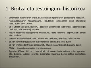 1. Bizitza etatestuinguru historikoa Erromatar Inperioaren krisia. III. Mendean Inperioaren gainbehera hasi zen. Kristautasunaren nagusitasuna. Teodosiok Inperioaren erlijio ofizialtzat hartu zuen, 380. urtean. 354. urtean jaio zen Agustin, Tagasten. Lehenengo ikasketak Tagasten egin ondoren, Madaurara joan zen. Arazo filosofiko-teologikoez kezkaturik, bere bilaketa espiritualari eman zion hasiera. Jarrera arrazionalistak hartu zituen, eta ondoren, manikeo bihurtu zen. 383an Erromara joan zen eta erretorika-eskola bat ireki zuen 387an kristau-doktrinak bereganatu zituen eta Anbrosiok bataiatu zuen. 396an Hiponako apezpiku izendatu zuten. Agustin 430ean hil zen, bandaloek Hiponako hiria setiatu zuten garaian, eta, Erroma jadanik erorita, Erromatar Inperioa behin-betiko suntsitzen zihoanean.