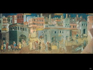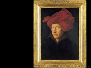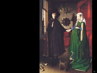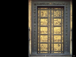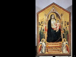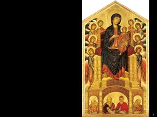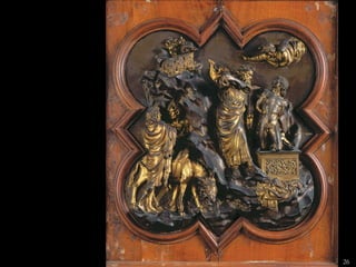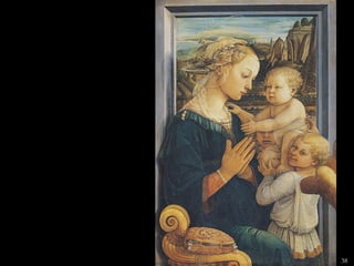 The document lists 26 artworks created between the 13th and 15th centuries by important Italian and Northern European artists such as Cimabue, Giotto, Ambrogio Lorenzetti, Jan van Eyck, Robert Campin, Lorenzo Ghiberti, Donatello, Sandro Botticelli, Fra Filippo Lippi, Perugino, Andrea Mantegna, and Luca Signorelli. The artworks include paintings, sculptures and altarpieces depicting religious subjects like the Madonna and Child, saints, and scenes from the Bible as well as portraits and secular subjects.
