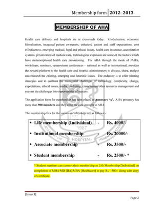 This document contains a membership form and information for the Academy of Hospital Administration (AHA). It outlines the various types of membership available, including life, institutional, associate, and student memberships. The eligibility requirements and fees for each type are provided. The privileges of membership include access to publications, discounts on training programs, and use of post-nominal titles. The last pages include the application form for individuals to apply for membership.