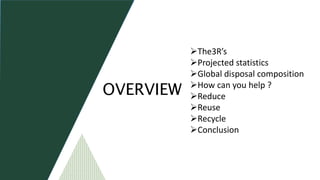 This document discusses the 3 R's of waste management: reduce, reuse, and recycle. It provides projected waste generation statistics by region between 2016 and 2050. Food and green waste make up the largest portion of global waste composition. The document encourages learning about the 3 R's and provides examples of how to reduce waste by buying only what is needed, reusing items like water bottles and computers, and recycling plastics, papers, and other materials. The conclusion is that following the 3 R's can help conserve natural resources and landfill space.