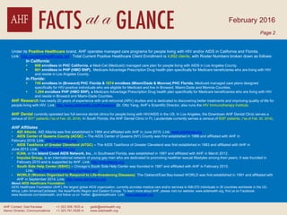 The document provides an overview of AIDS Healthcare Foundation (AHF) as of February 2016. It details that AHF operates in 35 countries worldwide, providing services to over 596,000 people living with HIV/AIDS. AHF has over 3,300 employees globally and manages 46 healthcare centers in the US as well as 319 clinics globally. It also operates pharmacies, wellness centers, dental clinics, and affiliates with various HIV/AIDS organizations throughout the US and world. The annual budget for AHF in 2016 is projected to be $1.3 billion.
