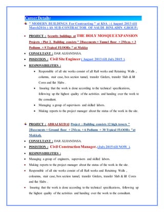 This document contains the resume of Ahmed Gamal Mohammed Ali, a civil engineer from Cairo, Egypt. It outlines his personal details, education history, work experience, skills and qualifications. He has over 10 years of experience working on construction projects in Egypt, Saudi Arabia, and Qatar as a site engineer and construction manager. His most recent role from 2015 to present has been as the civil construction manager on a high rise building project in Makkah, KSA.
