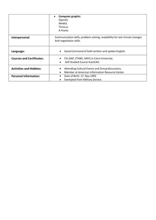 Ahmed Maher Tohami is seeking a challenging position as a Civil Informatics Engineer where he can utilize his academic and personal skills. He has a 9 month diploma in Civil Engineering Informatics from the Information Technology Institute in Egypt. His skills include .NET development, C#, ASP.NET, databases, GIS technologies, engineering informatics, computer graphics, and communication skills.