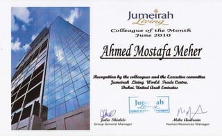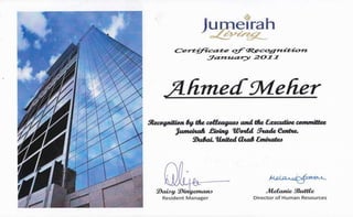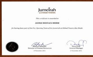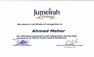 Ahmed Mostafa Meher is a highly adaptable and self-motivated hotel professional with extensive experience in operations, administration, front office, and finance. He has a proven track record of meeting targets through effective self and team management. He seeks to advance his career in an organization that values his management, supervision, and administrative skills for mutual growth and success.