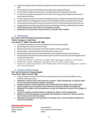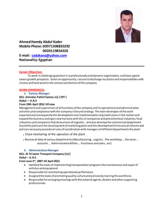 Ahmed Hamdy Abdul Kader has over 15 years of experience in management and supervisory roles in construction and logistics companies in Egypt, Libya, and the UAE. His career includes positions as Factory Manager for Emirates Pallet Factory in Dubai, Administration Manager for Al Ta'awon Transport Company in Dubai, Site Foreman for Sezay Turkish Fizi Akaya Construction Company in Tripoli, Libya, and Foreman and Store Keeper for Ajeed Construction Company in Egypt. He holds a B.A. in Social Communication and is proficient in MS Office applications and Windows operating systems.
