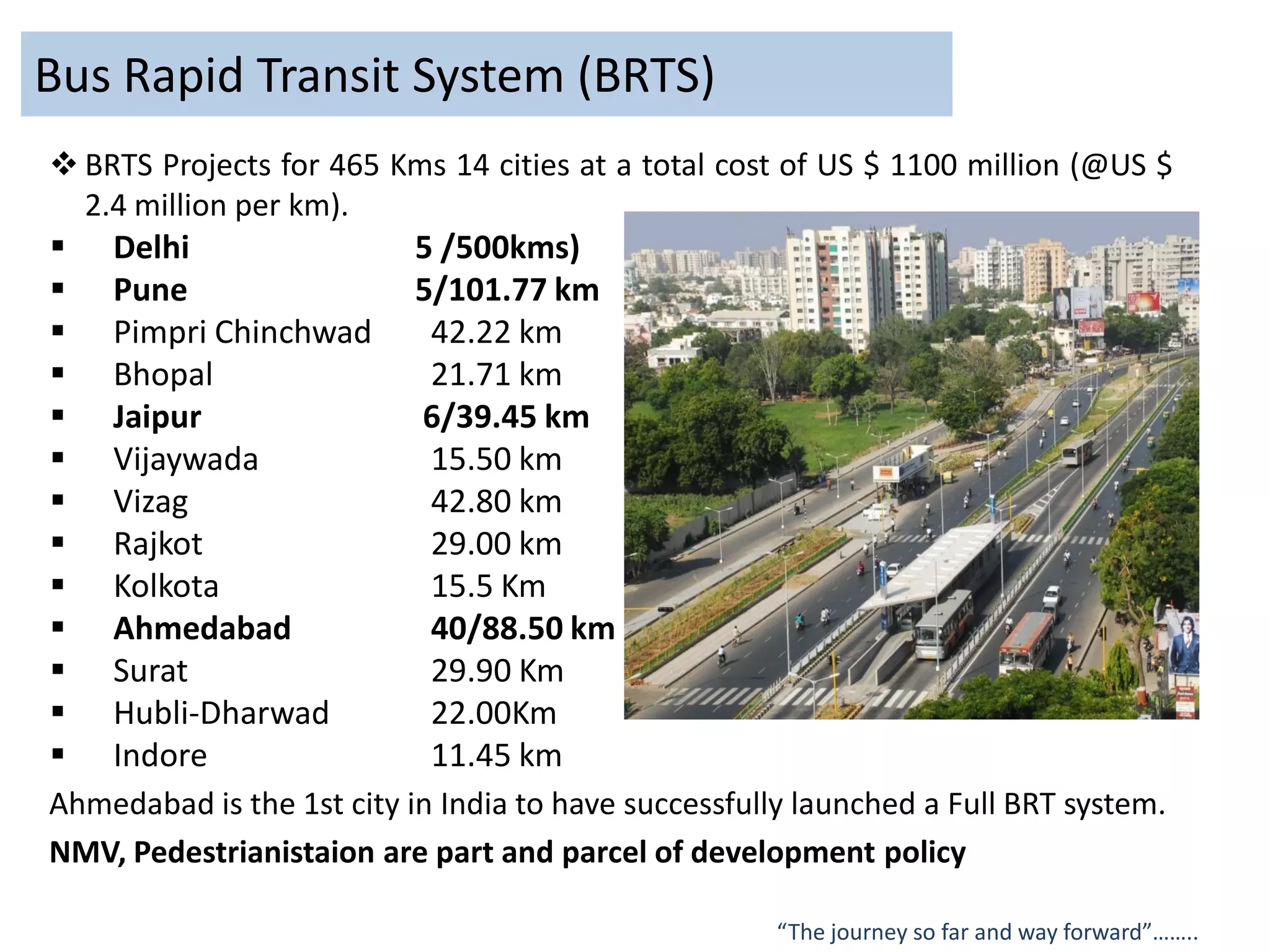 - Ahmedabad was the first city in India to successfully launch a full BRTS system, with 40 kilometers of dedicated bus lanes.