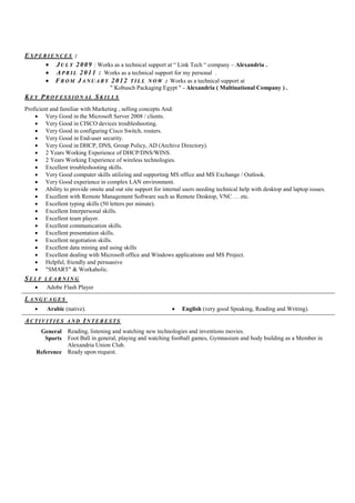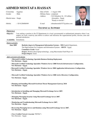 This document contains the resume of Ahmed Mostafa Hassan, an Egyptian citizen seeking a position in IT. He has a bachelor's degree in Management Information Systems from 2009. He has several technical certifications from Microsoft and Cisco. His work experience includes positions in technical support roles from 2009 to the present. He has strong skills in Windows Server, Cisco devices, Exchange Server, and remote management software. He is proficient in English and Arabic.