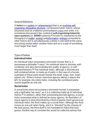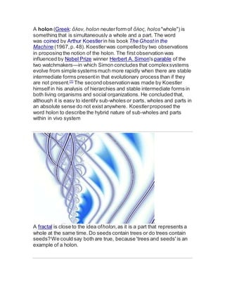 A holon is something that is simultaneously a whole and a part. The term was coined by Arthur Koestler to describe stable intermediate forms that exist in evolutionary processes. A holon is a self-organizing system composed of other holons that exists at the balance between chaos and order. Holons can be individual entities with their own identity or agency, or social groups with collective identity but no single leader. Artifacts created by holons are also considered holons, though they lack attributes like agency. Holons are useful for understanding complex multi-agent systems.