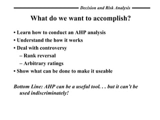 The document discusses the Analytical Hierarchy Process (AHP), a decision-making tool used to prioritize alternatives and build an additive value function. AHP attempts to mirror the human decision process by structuring decisions into a hierarchy and using pairwise comparisons. It allows for multiple decision makers and can provide weights for criteria, though inconsistencies may arise and it is controversial due to issues like rank reversal. The document outlines the AHP procedure and discusses measuring and addressing consistency in pairwise comparisons.